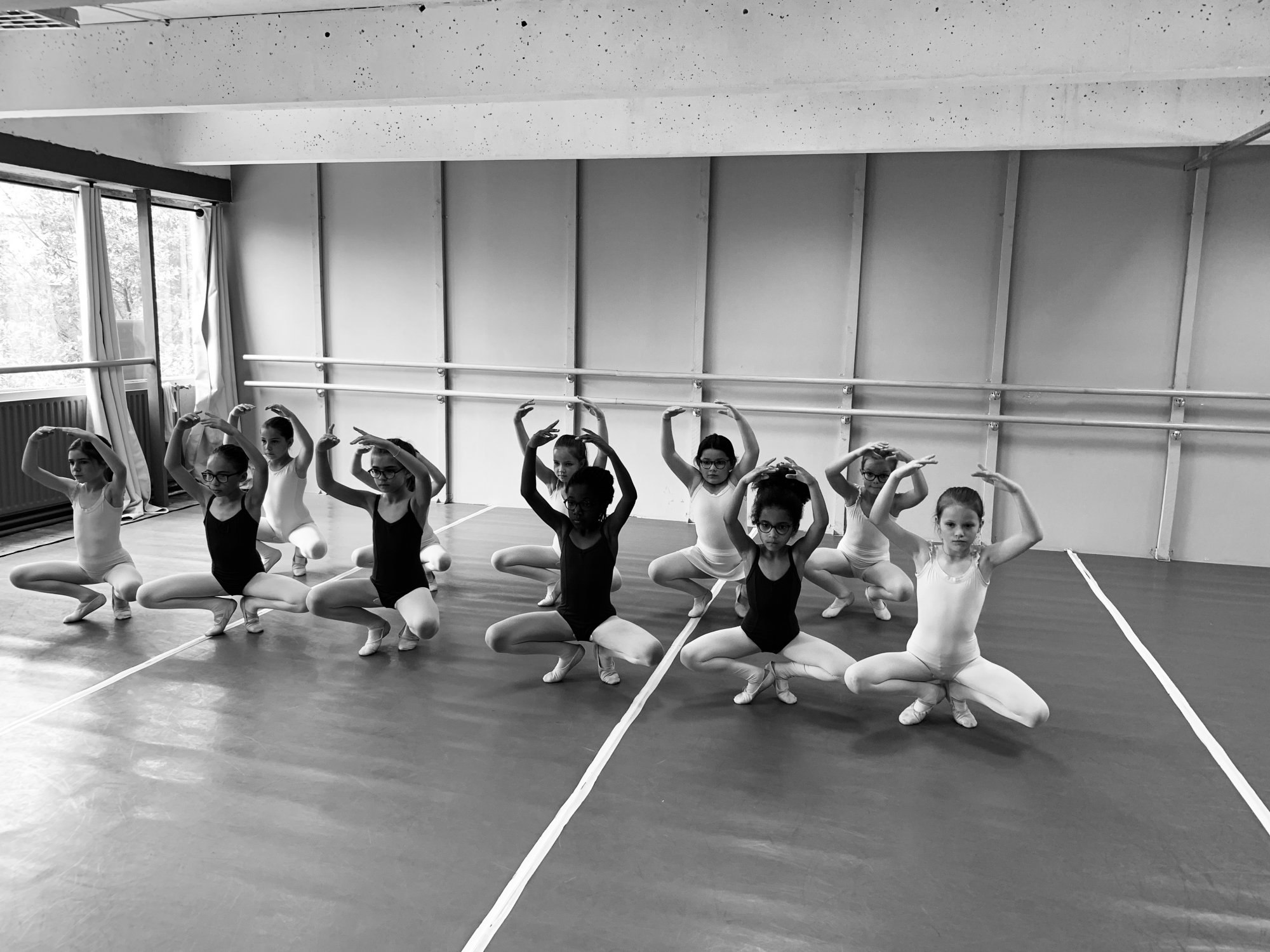 En fin de barre, le travail des étirements sera abordé pour travailler la souplesse de chacun. Puis nous enchaînons avec de courts exercices au milieu (Adage, Travail de petits sauts, d’équilibre et de grands sauts), évidemment tout ceci adapté au niveau des enfants.